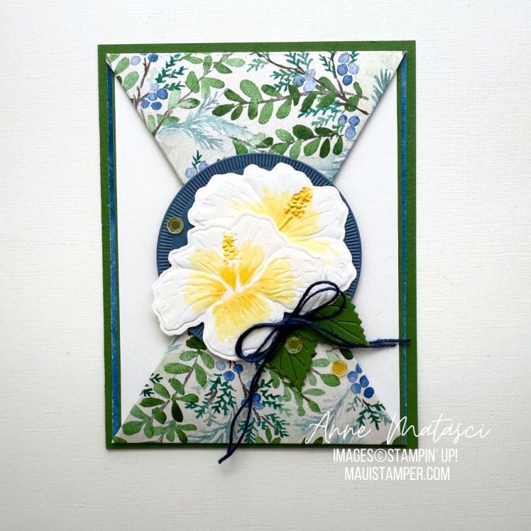 Accessories: Stamp Cut and Emboss Machine, Happy Hibiscus dies and Hybrid Embossing Folder, Blender Pen, Wink of Stella, Clear Sequins (Alpine Air kit), Stampin’ Dimensionals