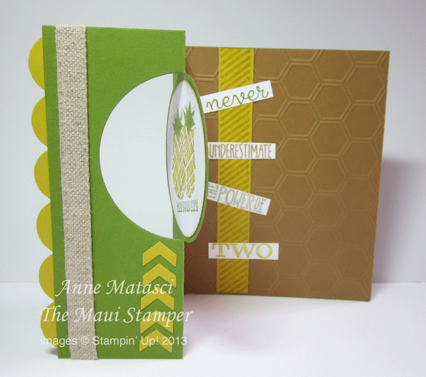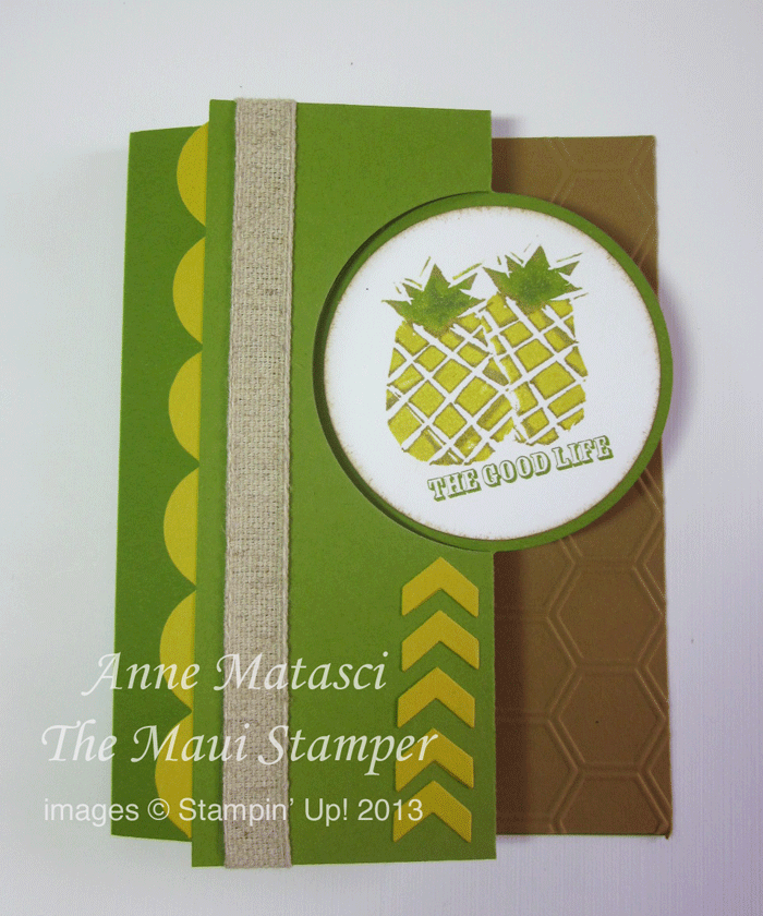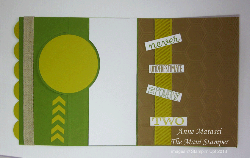 If you stretch the entire card out, this is what the first side looks like. You’re seeing the front of the card, the back of the flip, and the inside of the card. The Baked Brown Sugar panel was run through the Honeycomb TIEF before I adhered it to the Old Olive card base. I added a strip of white card stock (more details HERE) to the inside for additional writing space, and I put a Crushed Curry 2 1/2″ circle behind the flip to give it a finished look. I might write an additional note here, or I might add a photo. And yes, this is an extended card. Patty Bennett has made an excellent tutorial – see it HERE.