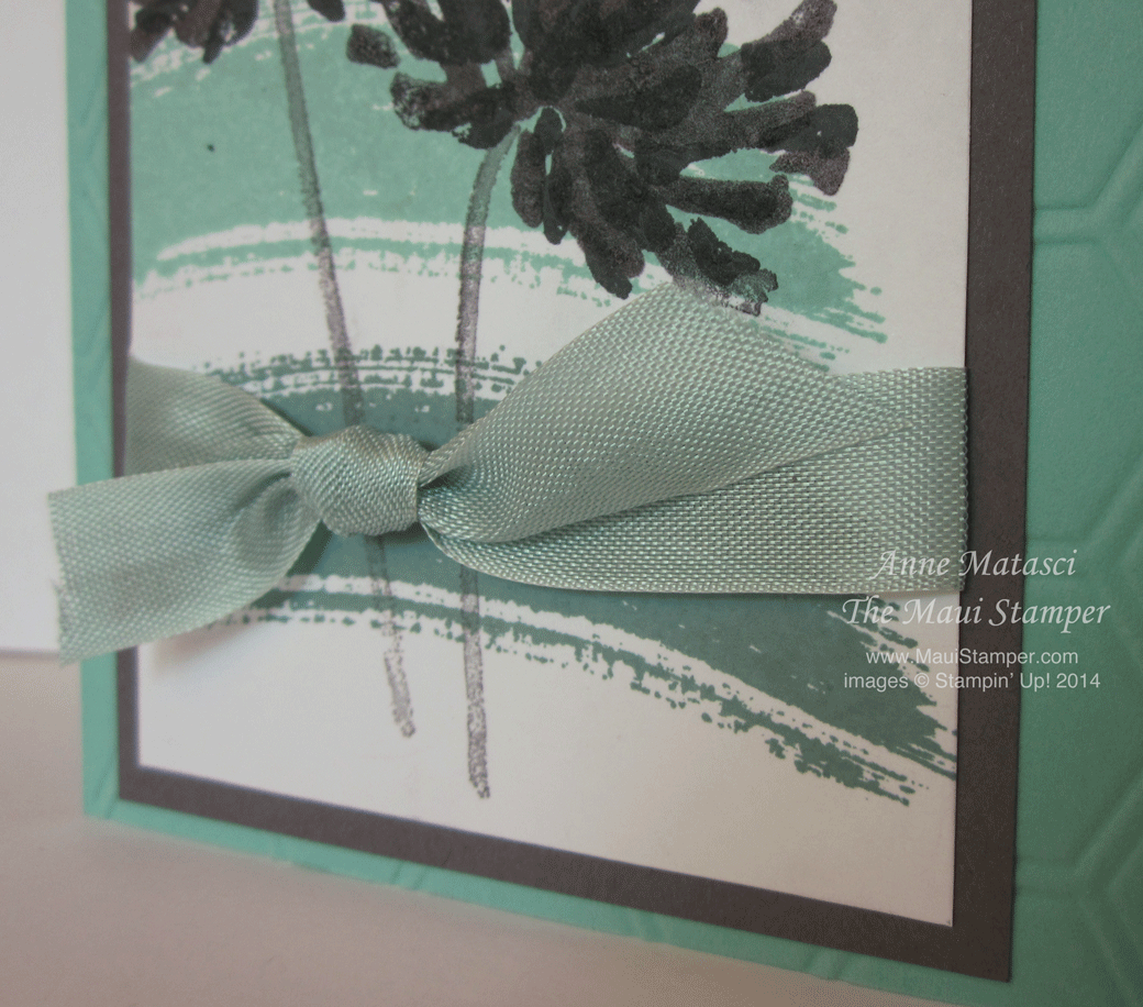 Turn the card over to see the second side. If you look closely at the Natural Trim ribbon you’ll see that I butted the edges on the diagonal to create a finished edge – I didn’t want a knot or a bow. It also creates a more finished look over the scallop trim from the Tasteful Trim Bigz XL die. I used a full-height piece of Sticky Strip to secure the trim.