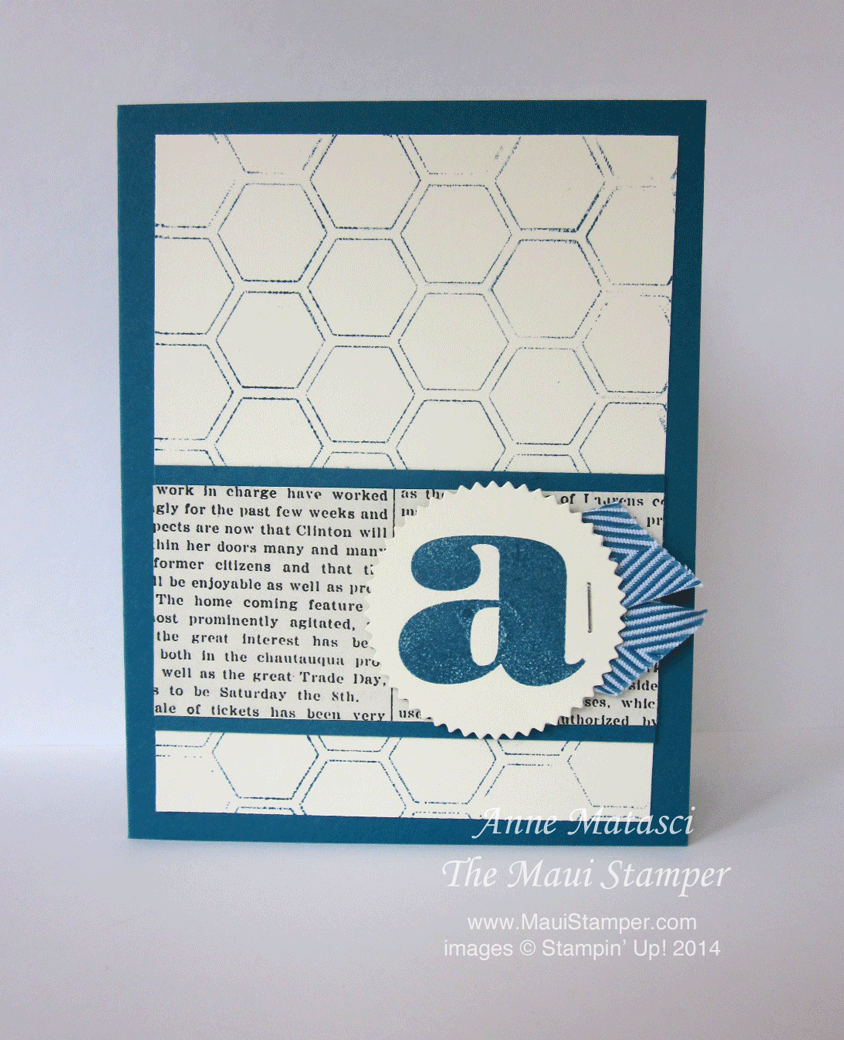 I stamped this sentiment from Yippee Skippee three times in three colors of ink and cut them up. There’s a strip of Crushed Curry card stock stamped with the diagonal lines from Gorgeous Grunge behind the words to serve as an anchor. Lining that up was definitely a job for the Stamp-a-ma-jig.