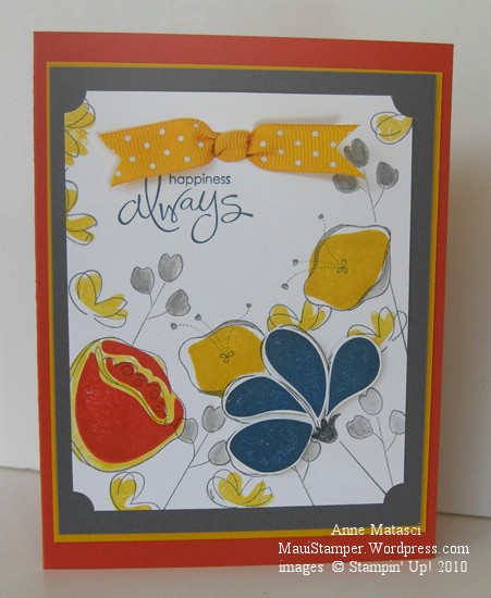 I like these strong colors together, and before long I’ll have to find a nice Man Stamp Set and try again. I just got a couple of new things from the Summer Mini and one of them will be perfect.  (Hijack: Don’t you hate it when you have decided you don’t need something and then you see not one, not two, but an abundance of projects using that same rejected stamp set? And where on earth did the word “hijack” originate? Off to the old Funk and Wagnalls…)