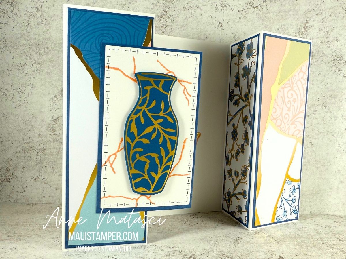 - Accessories: Stamp Cut & Emboss Machine, Impressions Abloom dies, Perennial Postage dies, Gallery Blooms dies, Exposed Brick 3D Embossing Folder, Kintsugi Inspirations DSP, Dauber, White Bakers Twine, Wink of Stella, Fine Tip Glue pen, Stampin’ Dimensionals