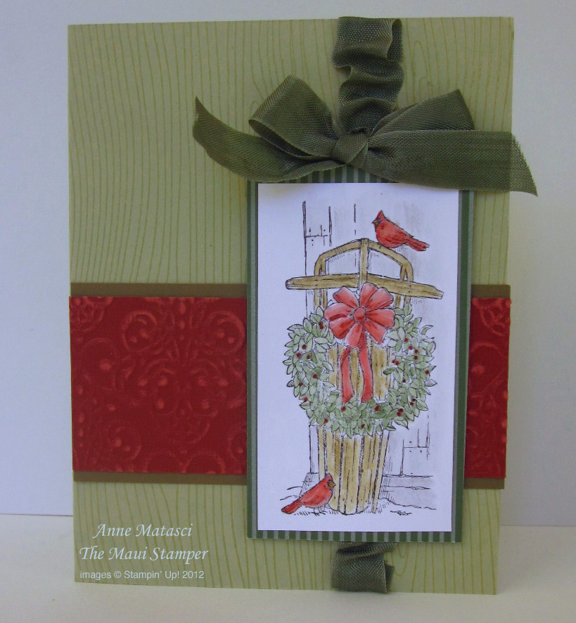 We made these in Hostess Club this month. Everyone thought “The Rose” would be difficult, and I think everyone was pleasantly surprised to find that it’s really very easy. This is two layers of Core’dinations paper run through the Lattice TIEF – the embossing folder helps to soften the paper. I used the scallop tag topper punch on both ends of a 6″ long piece of paper to create the little packet for the chocolate. (Yes. You knew that what was in there, didn’t you?)