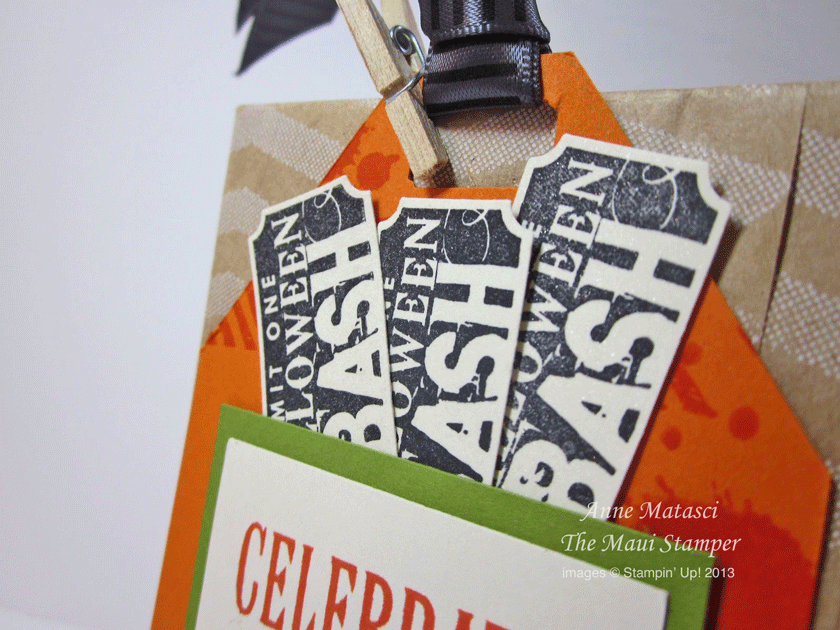 The Halloween Bash stamp set has fun images to play with, and I thought these tickets were just the thing to add to the top of my tag. They’ve got a little sparkle courtesy of Vanilla Smooch spritz. And the hole for that gorgeous ribbon at the top is made with the small ticket punch – it makes a generous opening. I’ve used the beautiful black and grey striped ribbon that’s available again as part of the Halloween Banner Simply Created Accessory kit.