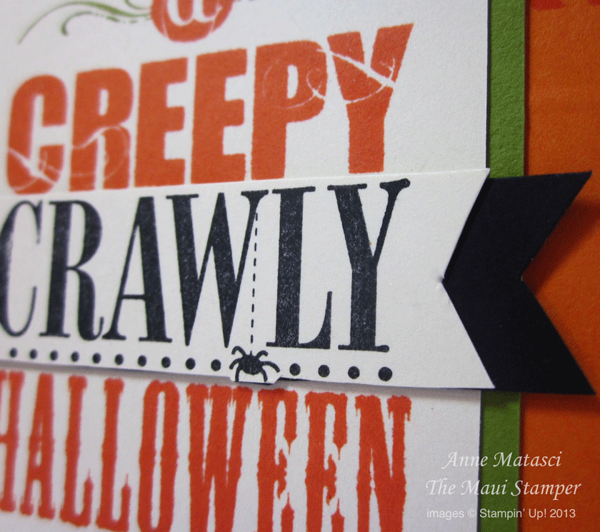 I stamped the main image once in Tangerine Tango, then again in Black Staz-on. I cut out the word “CRAWLY” in black, snipped the ends, and added Basic Black card stock extensions to the ends. The black rhinestone gems at the bottom are colored with the black Sharpie® marker that NEVER leaves my desk!