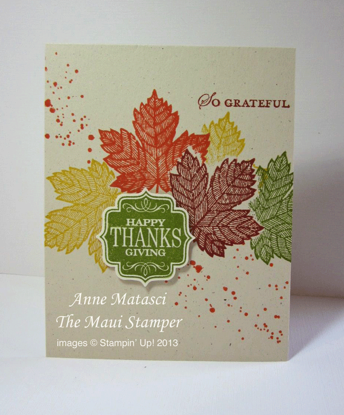 Magnificent Maple is a single stamp and it is truly a magnificent rendition of a leaf. I’ve masked and stamped it in Crushed Curry, Tangerine Tango, Cajun Craze and Old Olive. I chose Naturals Ivory card stock for the card base, but I used Very Vanilla for the tag – the Naturals papers have just enough texture to them that a bold image such as that tag doesn’t come out with enough definition to please me.