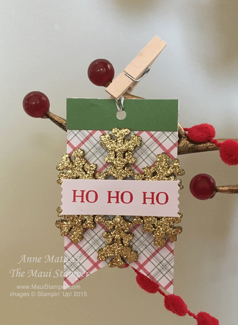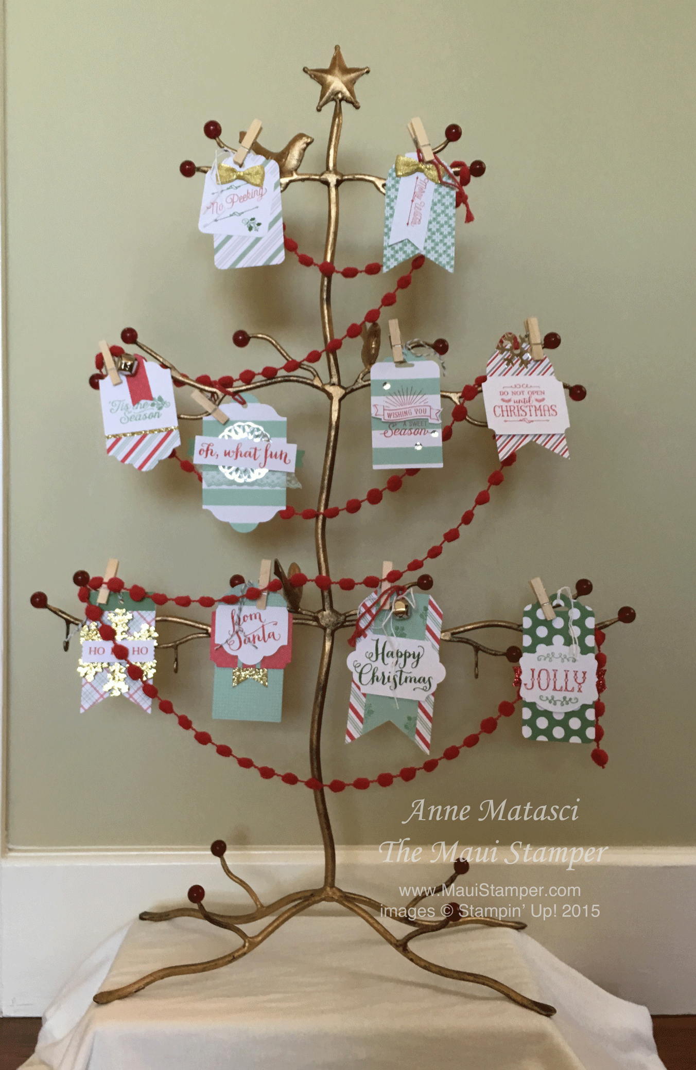 I’m a big fan of using things that I have on hand when I’m looking for a last-minute solution, and last month I assembled the Oh What Fun tags kit (#139602, on sale for $14.70 for 30 tags) just for this purpose. I also try to keep our packaging solutions on hand – this is the Petite Café Gift Bag (#135826, $6 for 10 bags). Finally, this time of year I stock up on fun ribbon, and nothing says FUN like the Real Red PomPom Trim (#139617, on sale for $4.20 for 5 yards). I added a little 1/8″ Striped Ribbon to finish off the package (#139615, on sale for $6.40 for 5 yards each red and green stripe ribbon).