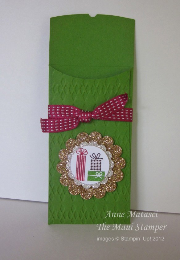 I love the Petite Pocket die for favors. It’s a fun size and shape for anything from pencils and crayons to Pixie Stix or even Stampin’ Spritzers! This image is also embossed to make it easier to color with markers – I’m a messy, outside-the-lines artist. A few quick accents and these little pockets are done – with our beautiful, two-sided DSP this is an easy project to mass produce.
