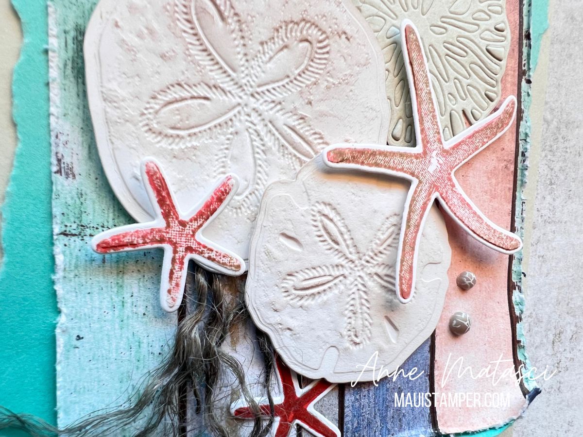 This is one more card using our Hybrid Embossing Folder magic. If you choose not to put the dies into the folder, you’ll have a lovely embossed image to work with, but I love those sand dollars and knew I wanted to cut them out.