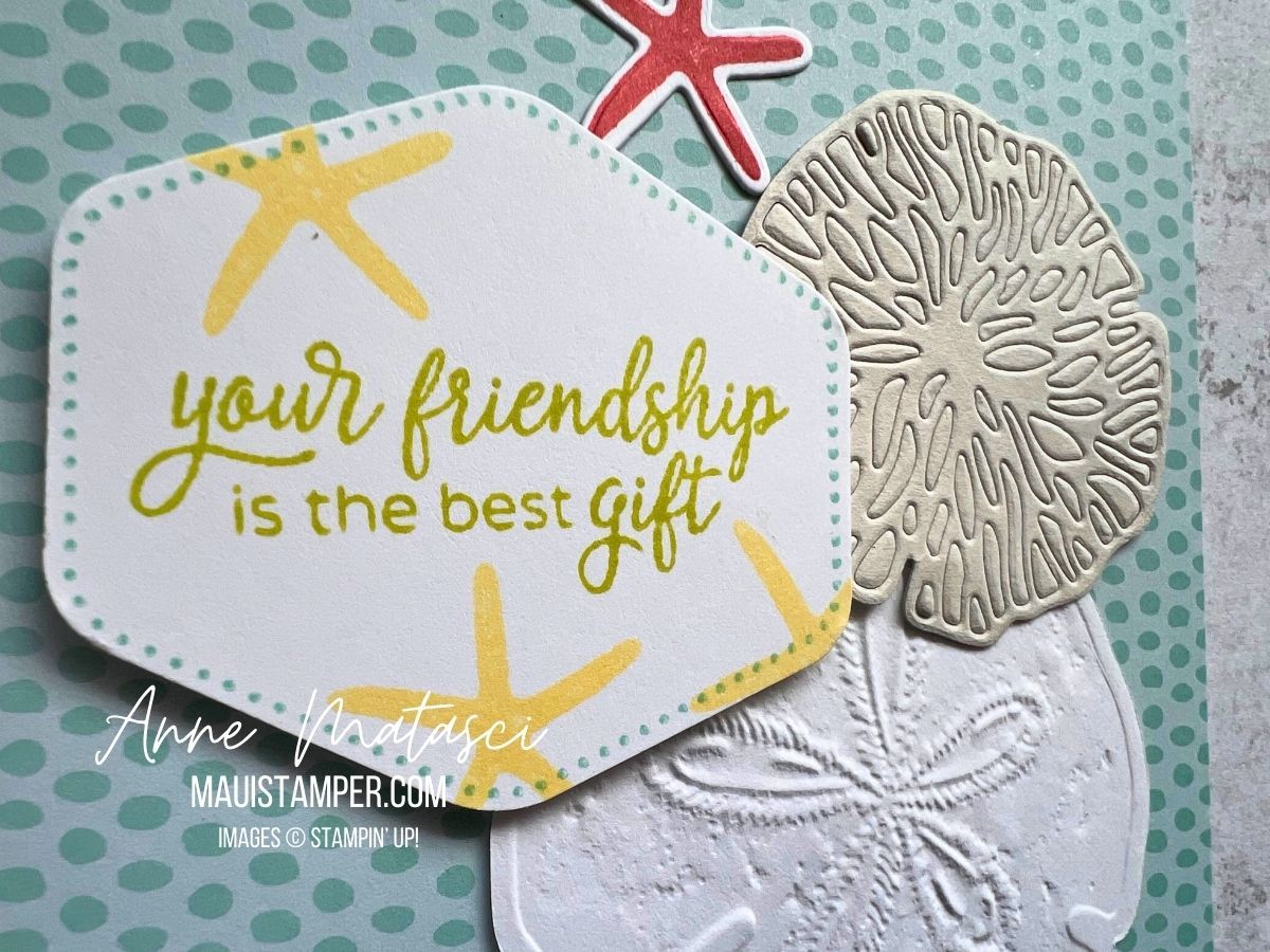 I chose Calypso Coral – a pretty bold color – for the sea stars, since the rest of the card was soft and neutral. Even Lost Lagoon seems subdued in comparison, and the contrast really works for me. I hope you think so too!