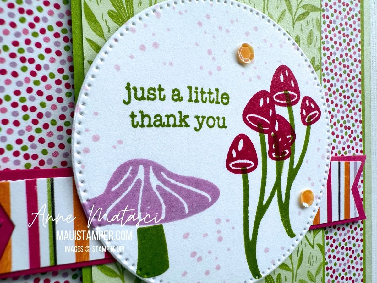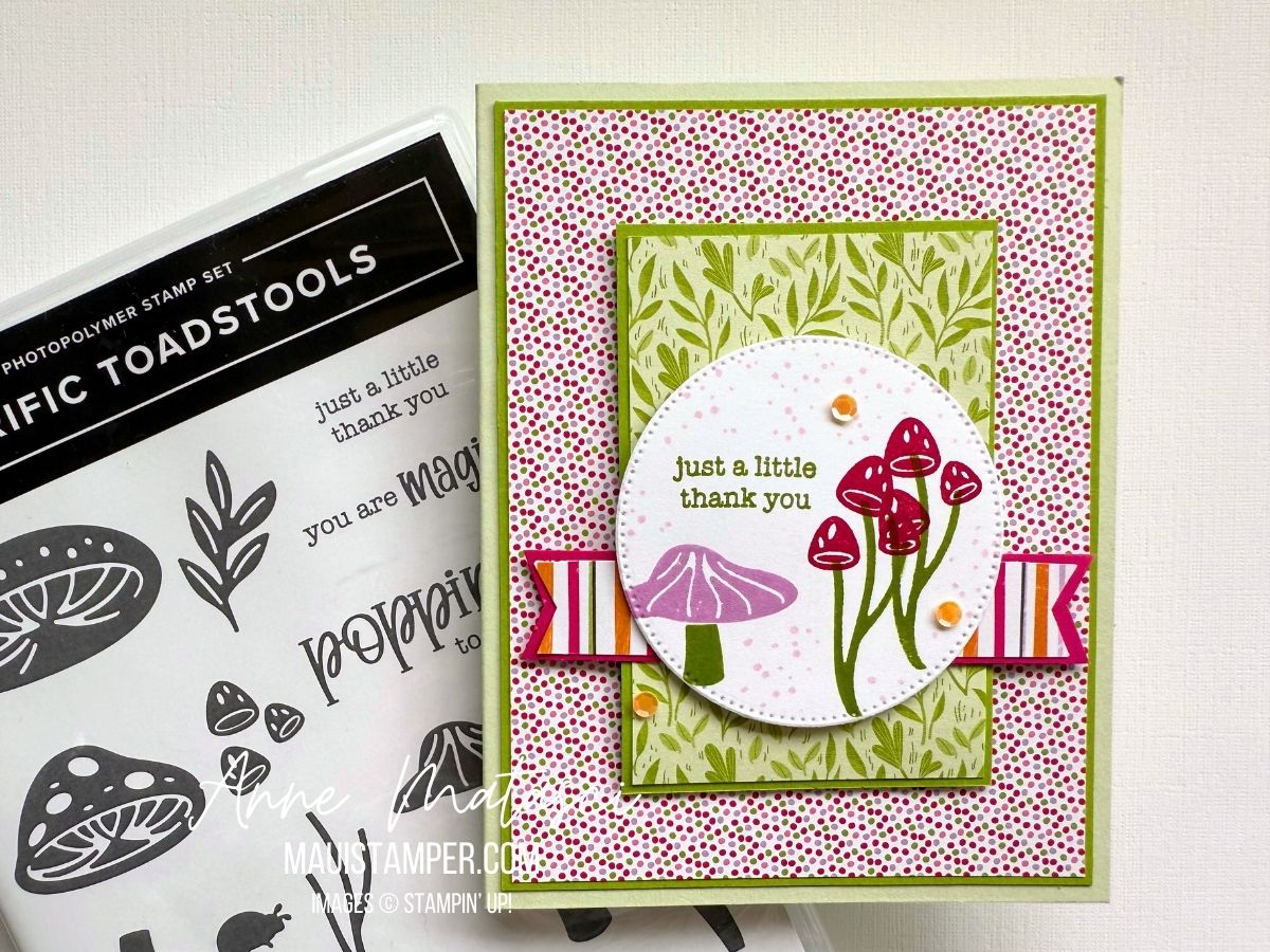 Here’s another Slice and Slide card featuring the Terrific Toadstools stamps and the coordinating Designer Series Paper available during Sale-a-bration 2025: