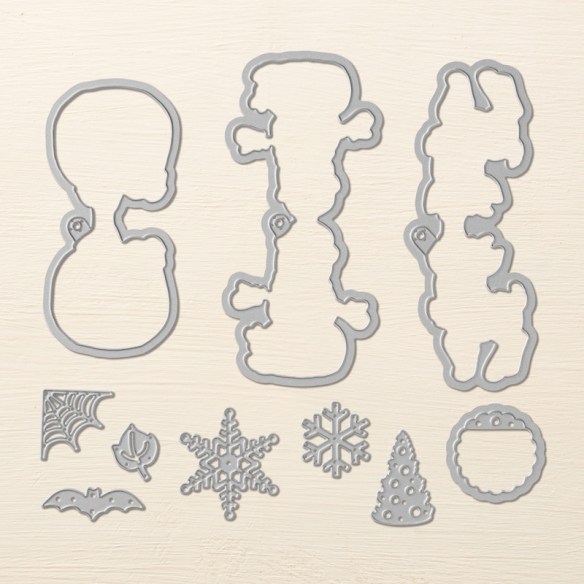 Seasonal Chums is a bit of a sleeper. It was featured in last year’s Holiday catalog, and to my surprise and delight was continued in the 2018-2019 Annual Catalog. The images are presented in pairs, front and back, and the coordinating framelits let you cut them out to create tags. The jack-o-lantern is an absolute classic!