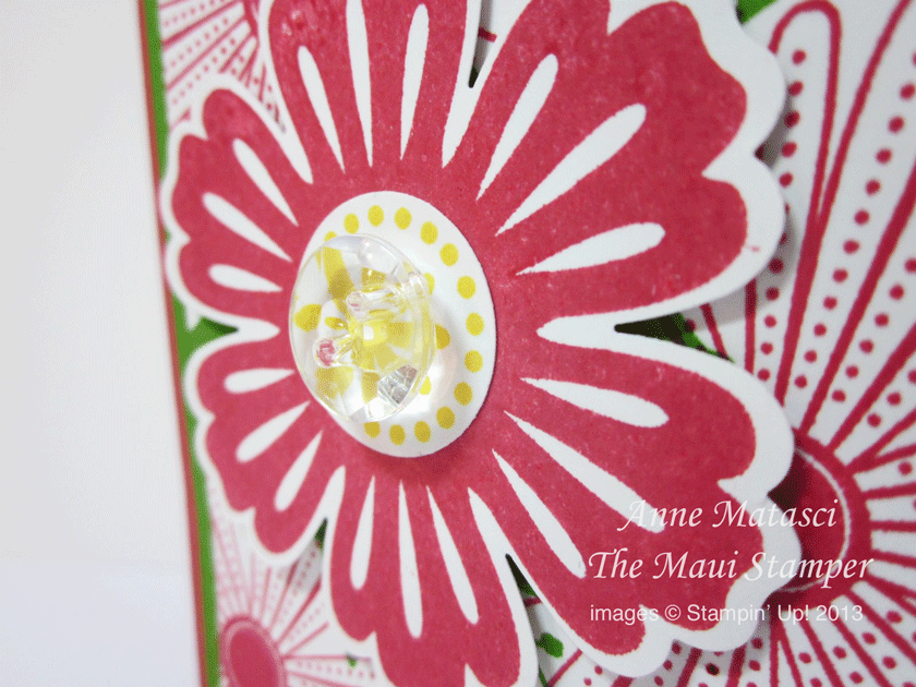 - Accessories: 2 1/2″ circle punch, Greetings thinlits (retired and sold out, sorry!), Linen thread, Stampin’ Dimensionals, Timeless Elegance DSP