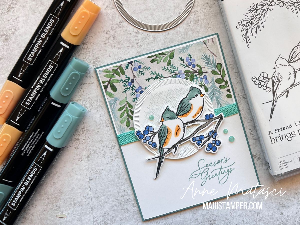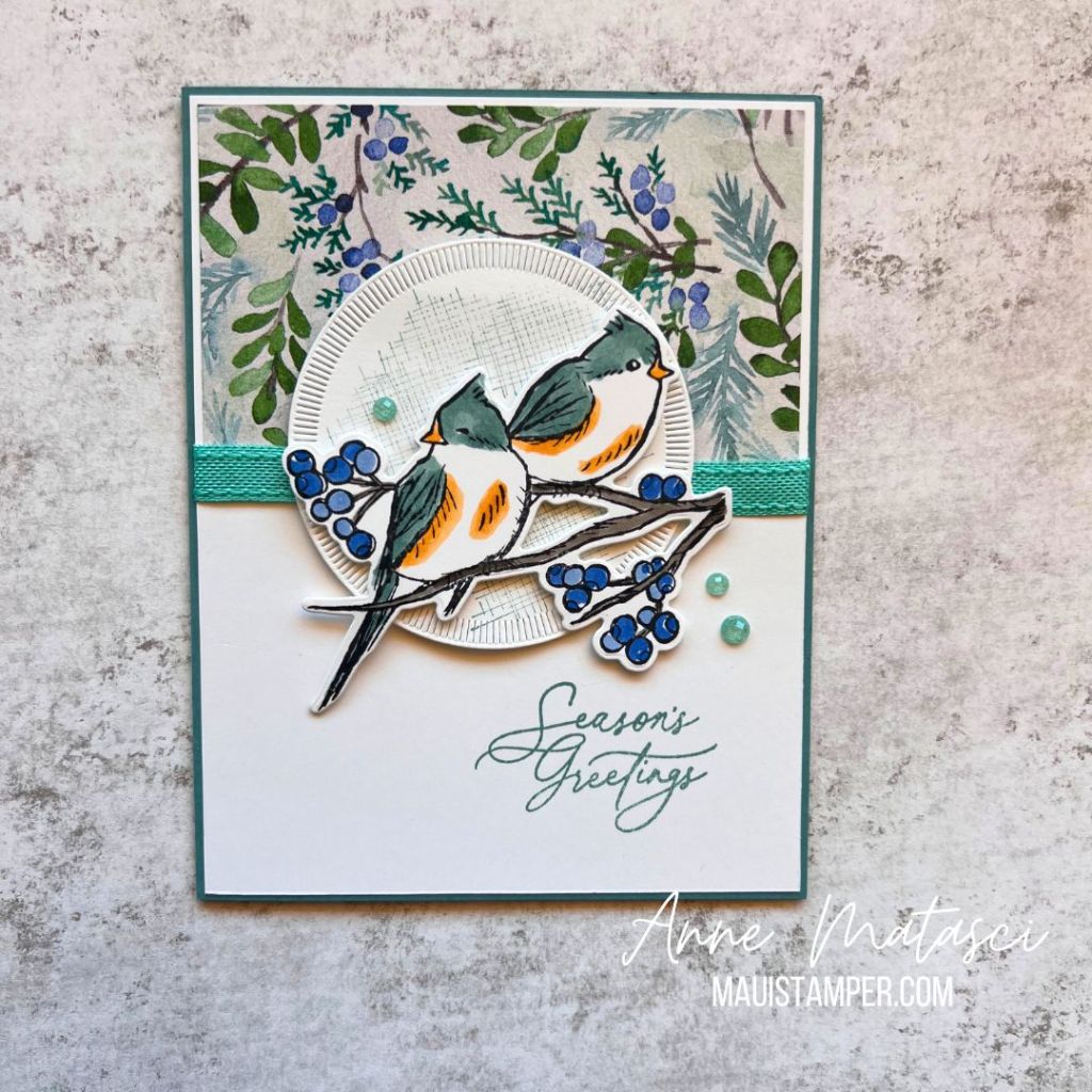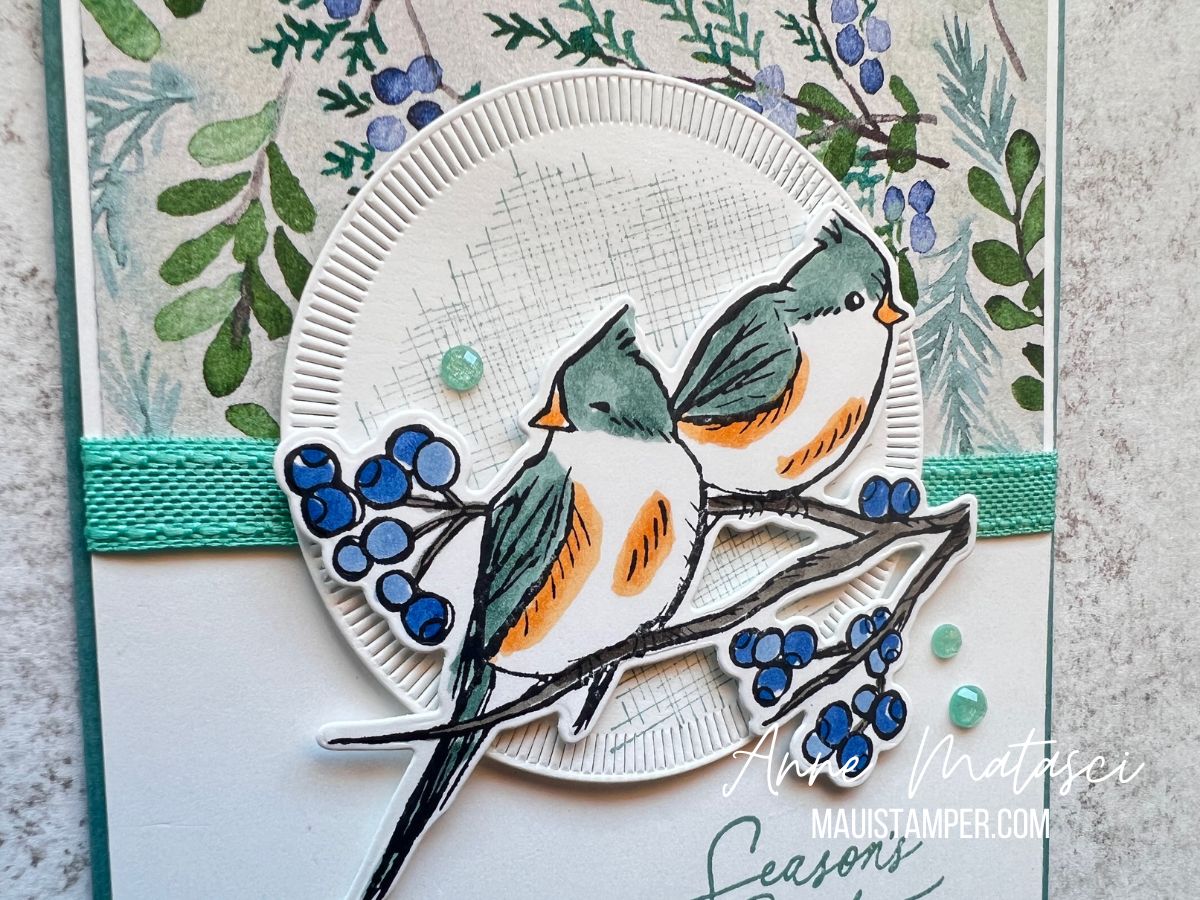 I used the grid from Spotlight on Nature to add some texture behind the pair. Texture is one of my favorite simple add-ons. It’s quick, it’s easy, and it doesn’t add any volume to the card. I took my coloring cues from that gorgeous Winter Meadow DSP, and I slipped in the Summer Splash ribbon even though it’s nit technically in the paper. I think it works!