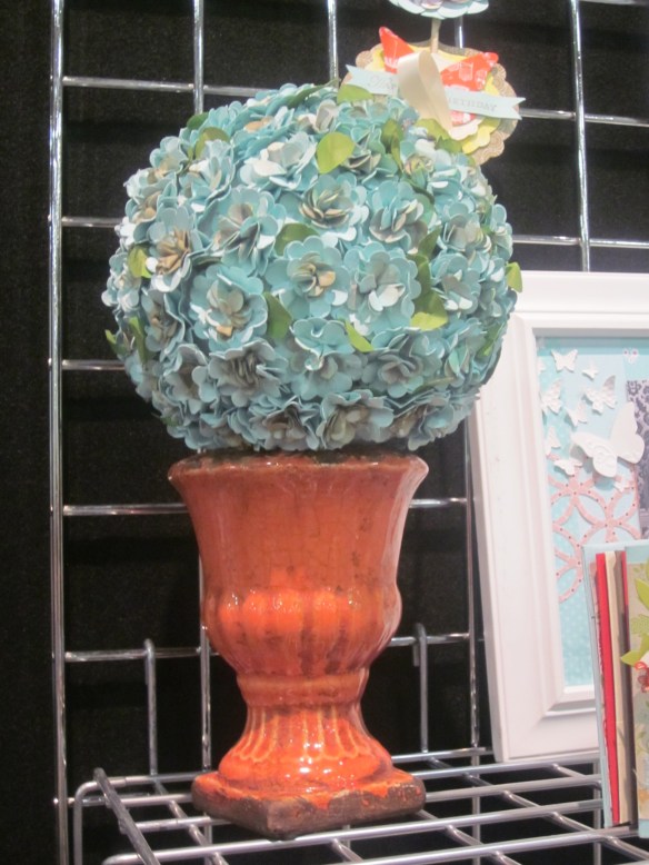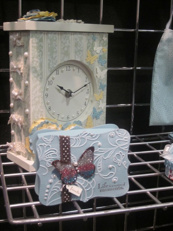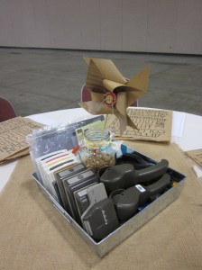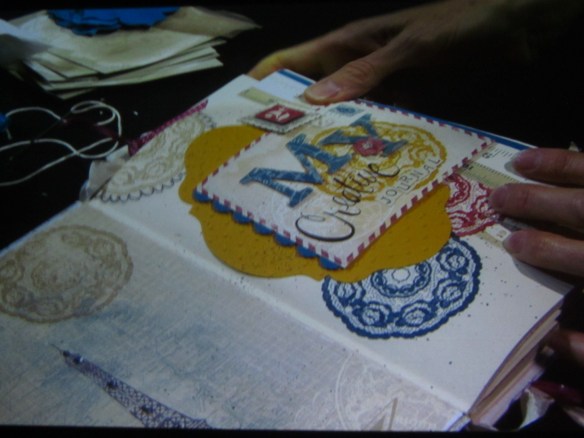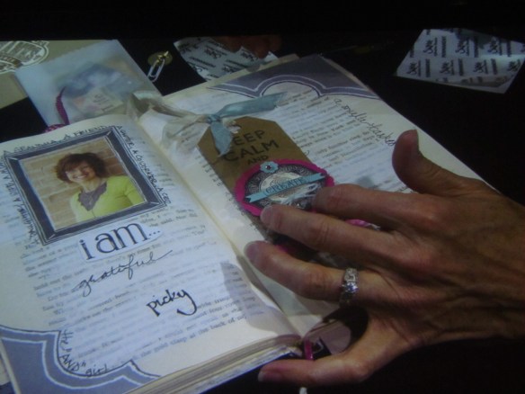 Our final session of the day was Main Stage presentations. The highlight was Shelli’s stamping presentation, and everyone’s favorite project was her gorgeous altered book. Because of the personal nature of the book she said she wouldn’t display it in the Demonstrator Resource Center, so I took photos from the video screens. It’s similar to a Smash Book, if you’re familiar with that concept, but she designed it as a creative journal: