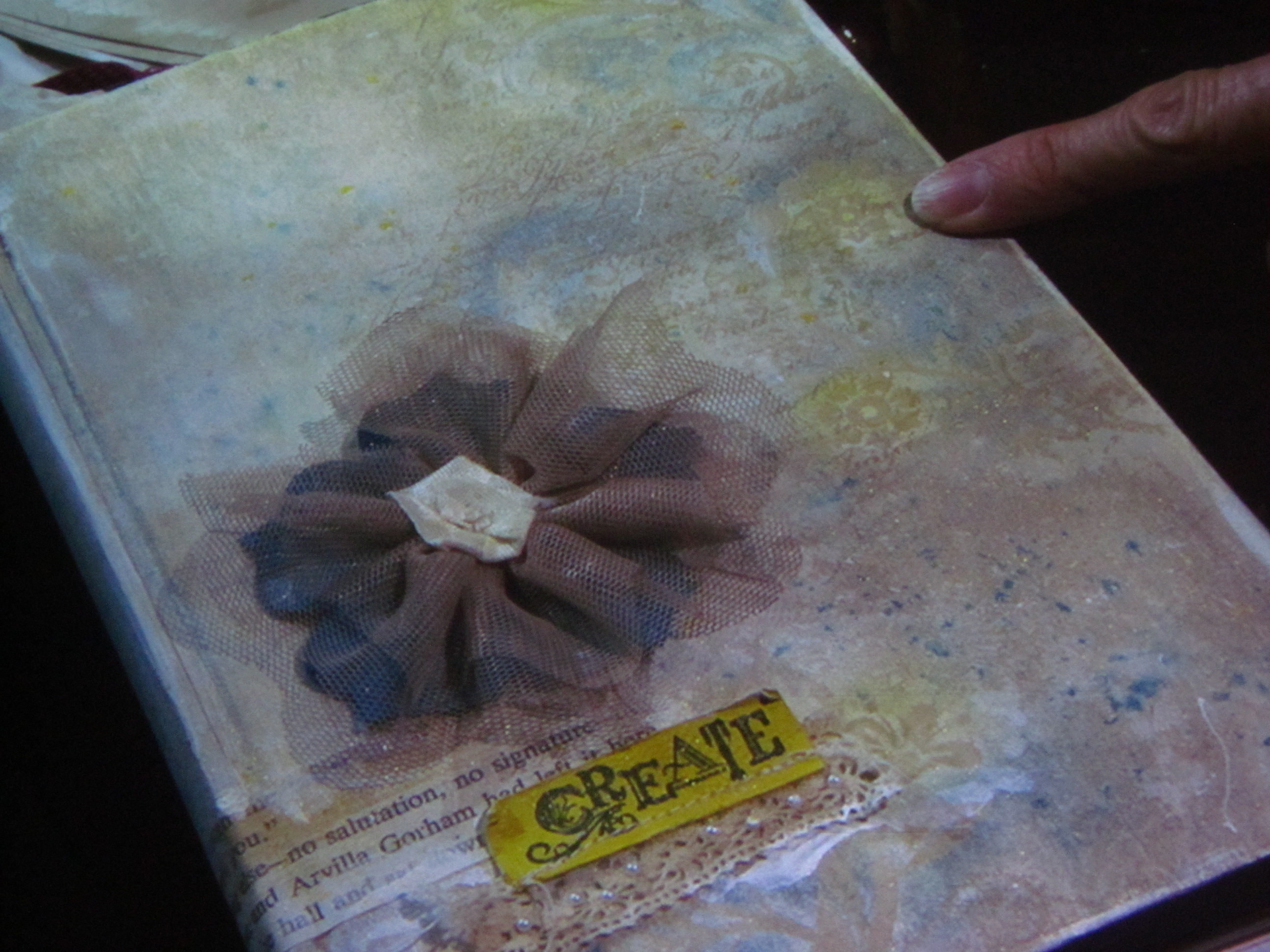 This is the cover – complete with a tulle rosette (tulle ribbon coming in that Holiday Mini!) She covered an old book in gesso and then inked, spritzed, and stamped it to get that shabby chic look. This photo doesn’t do it justice.