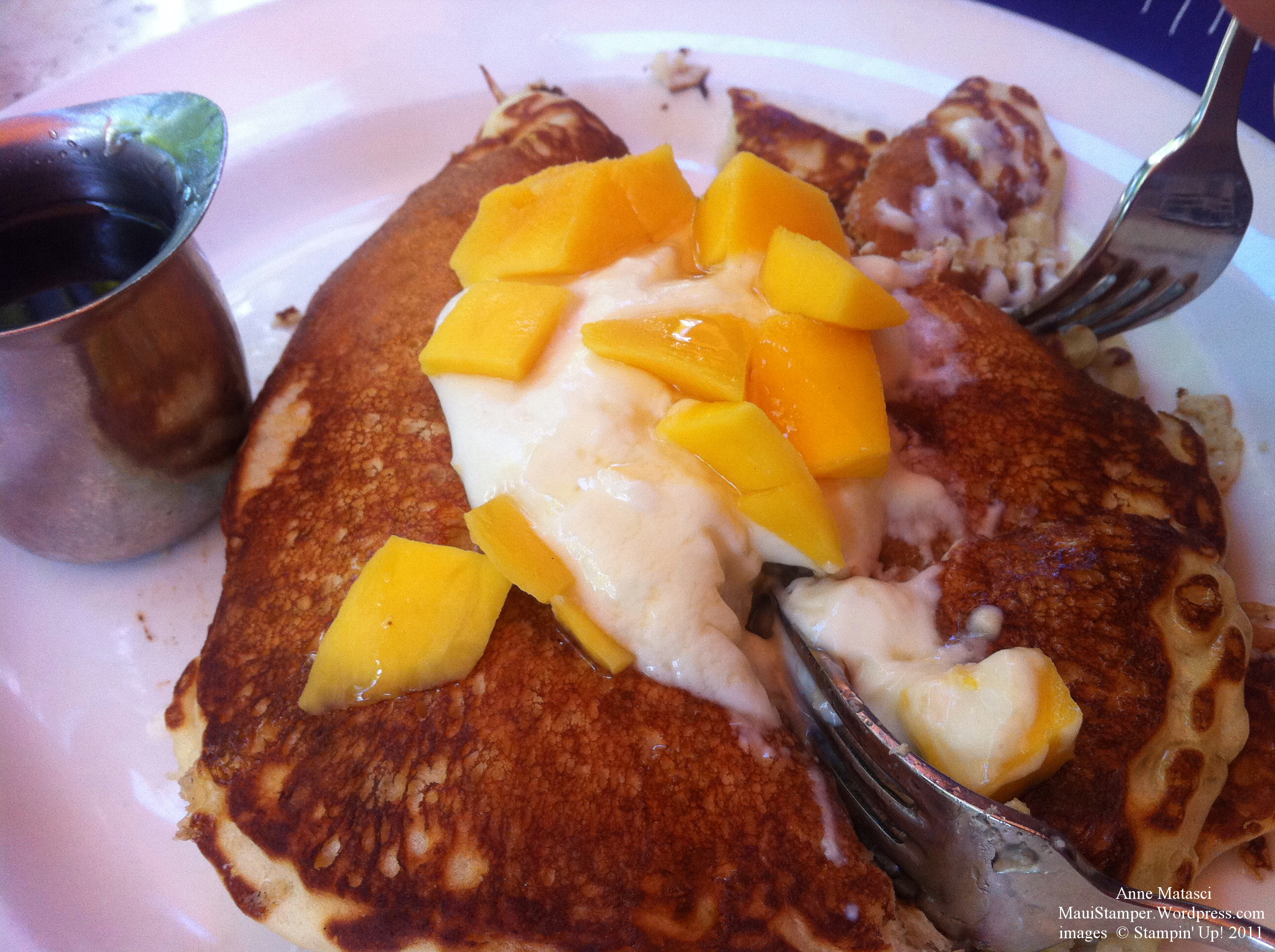 Speaking of things I’ve been meaning to do, I finally got my two bites (ok, three) of pancakes. My son has been on the mainland for a month and he flew home yesterday. To celebrate his return home, the two of us had breakfast at Longhi’s this morning. A couple of weeks ago, Mr. Maui Stamper and I had breakfast there, and he rejected my suggestion that he order Longhi’s famous and perhaps even more fabulous Ricotta and Mango Stuffed Pancakes. Mr. Maui Stamper cares about his health, and I care about my waistline, and neither one of us could justify an entire plate full of such decadence. But I wanted some of those pancakes, so I convinced my son that we should go out to breakfast this morning since his dad is now away. Of course, I would be happy to order for him.