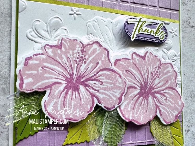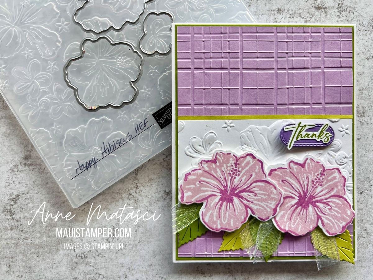 Accessories: Stamp Cut & Emboss Machine, Happy Hibiscus dies and Hybrid Embossing Folder, Forever Plaid 3D Embossing Folder, Changing Leaves dies, Iridescent 1/2″ trim, Stampin’ Dimensionals, Paper Snips