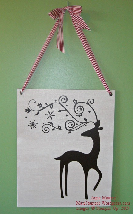Crystal added a bow and some bling to her Dasher, but I decided mine was going to be a Manly Sort of Reindeer. I used the Crop-A-Dile (seriously!! it worked great!) to add a pair of Jumbo Eyelets to the top corners, and broke out my precious stash of retired Riding Hood Red striped grosgrain ribbon to thread through the eyelets and tie in a bow.