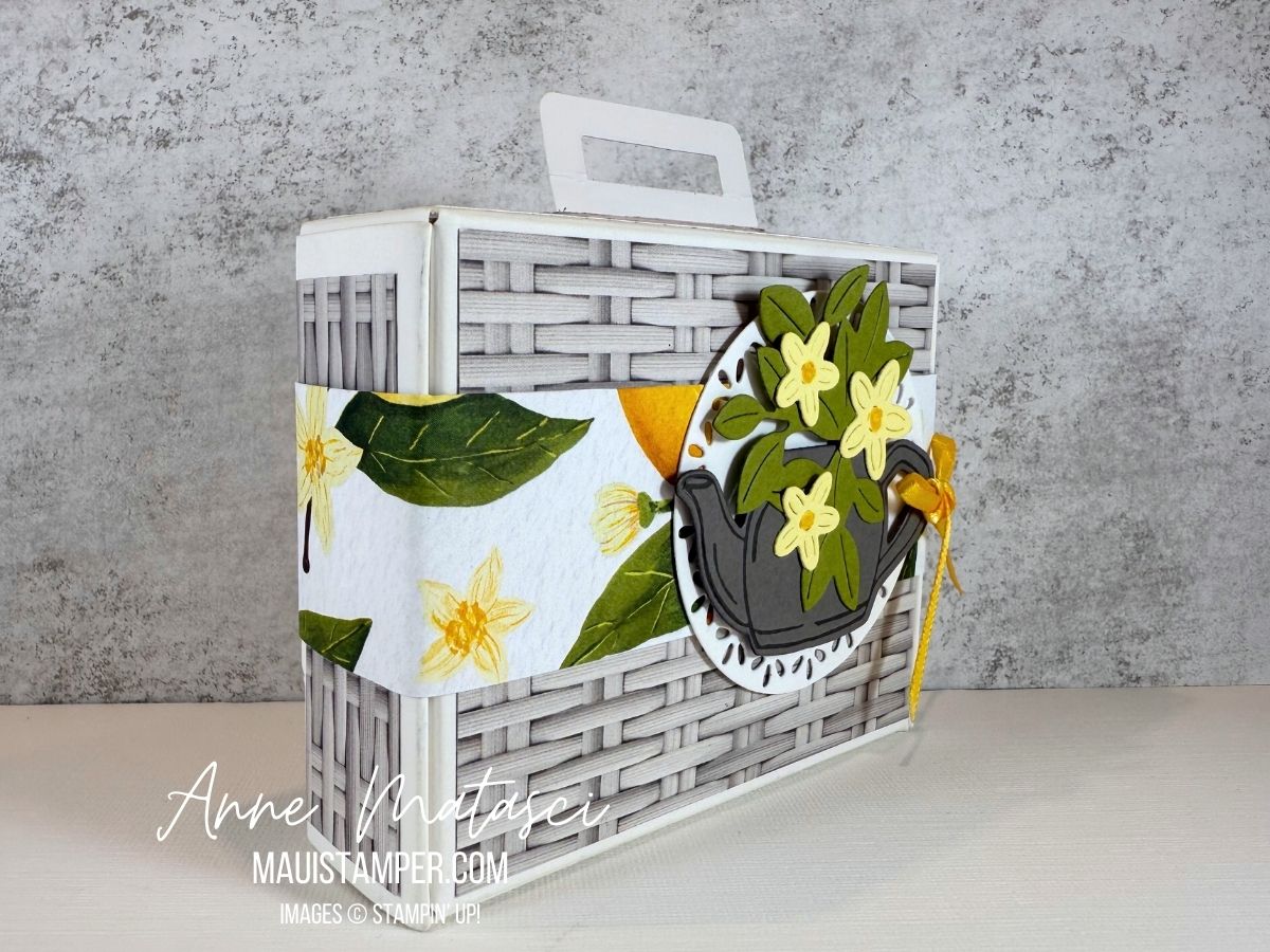 - Accessories: Stamp Cut & Emboss Machine, Branching Out dies, White 1/4″ ribbon, Woven Textures DSP, Blending Brush, Stampin’ Blends, Stampin’ Write Marker, Stampin’ Dimensionals