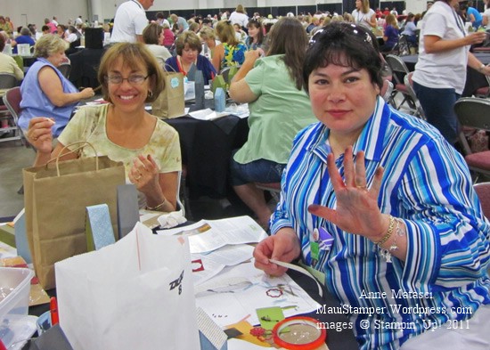 Cheryl is sitting next to Priscilla, who was the BEST EVER table-mate and fit in with our craziness absolutely perfectly. Priscilla was much neater at this than I was, as I seemed to have ink AND paint all over my hands. You have to feed the muse.