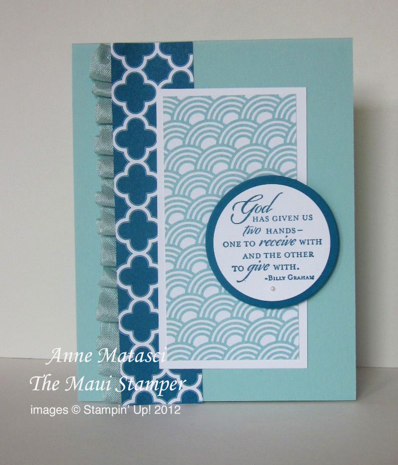 The Maui Stampers got together last week to celebrate. One of our members moved to the mainland last summer, and she was back on Maui to help out the folks that bought her shipping business. We got together at the drop of a hat, ate some great food and made a couple of cards – this was one of them.