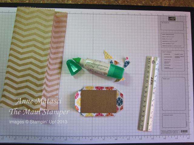 Pam showed us how to put the gusset in the bottom, and I’ll give you the instructions for that too, but I also want to show you one more Maui Stamper Original Idea (MSOI – you knew that was coming, didn’t you?)Â She suggested we put a little piece of grunge chipboard inside the bag (that kinda junk cardboard that keeps your Stampin’ Goodies from getting bent when they’re shipped.)Â My MSOI was to wrap that little bad boy so when you look into the package it’s pretty, not grungy.