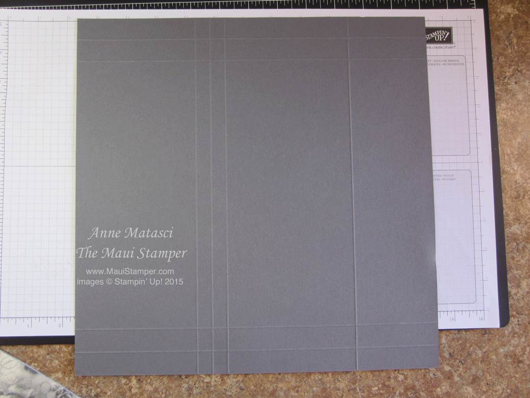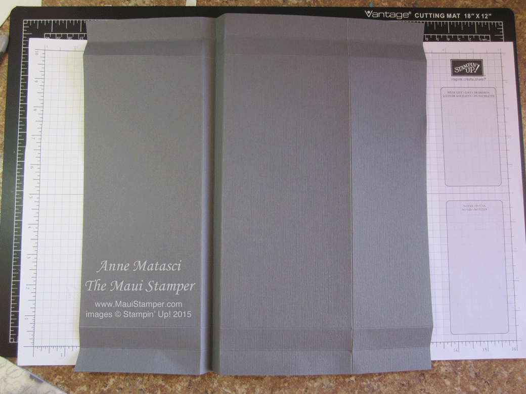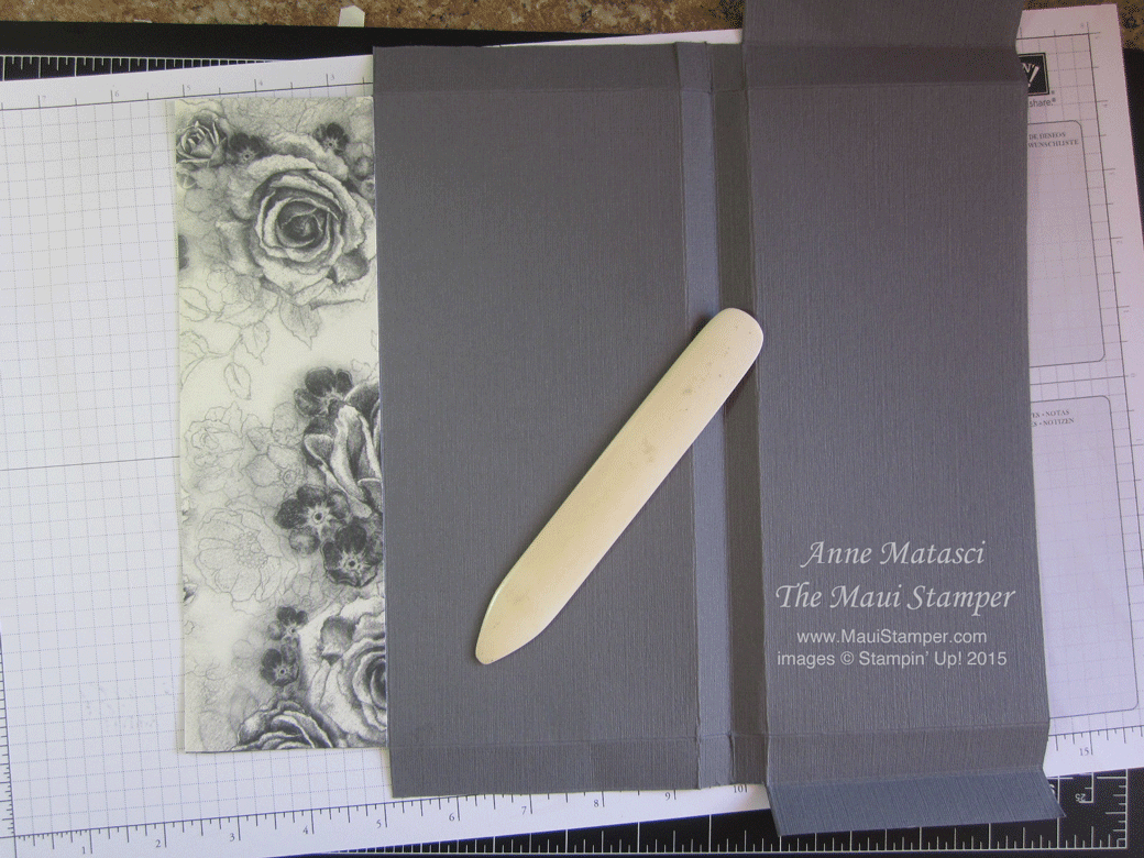 Adhere your DSP to the 9 inch wide flap. I use Tombo (the Wonder Adhesive) so that I can get as close as possible to the edge. (I use a bone folder to smooth out any bubbles and assure a smooth fit.) This is the fabulous new Timeless Elegance DSP, and I think it is gorgeous with Basic Grey card stock. Use the Corner Rounder punch to (wait for it) ROUND THE CORNERS. Lol. I know. I crack myself up.