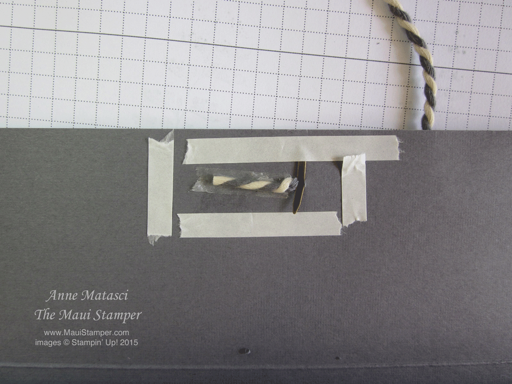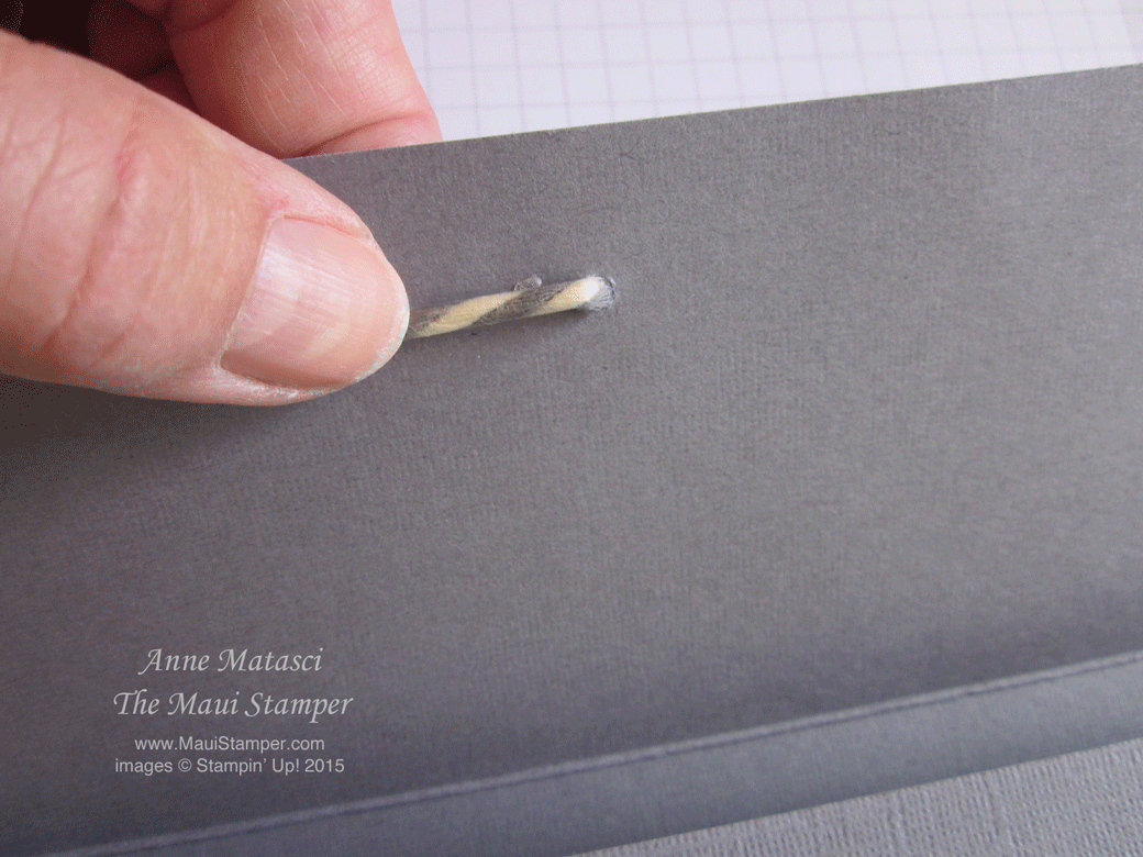 Almost done! Punch a 1/8″ hole in the center of the top flap and thread through your twine. Tape into place – I use the Tear and Tape because I can. (This beautiful Basic Grey and Vanilla twine is from the Gratitude for Days Simply Created kit on the Clearance Rack. It’s a steal at $8.79!)