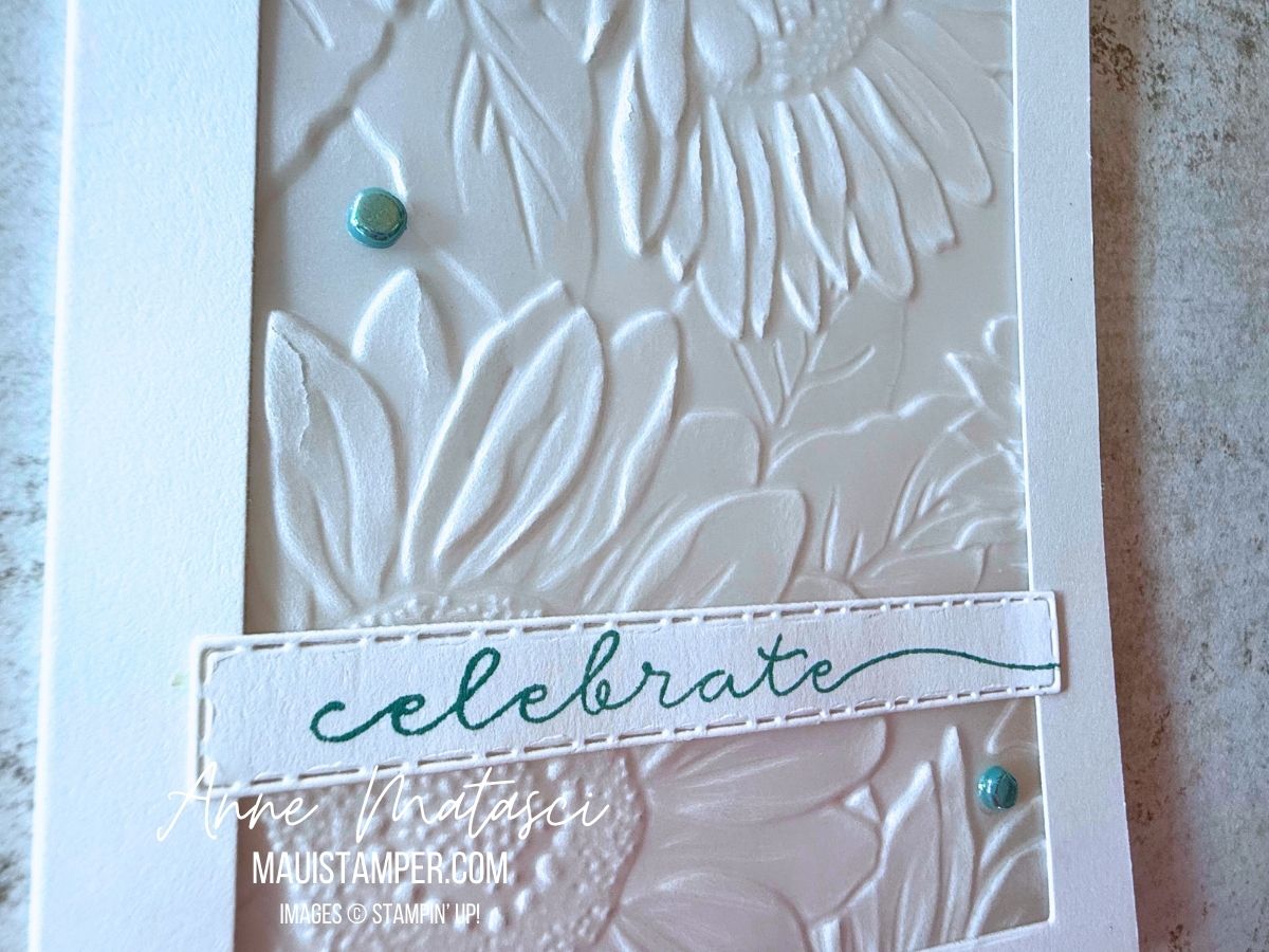 Apply Tear and Tape around the bumpy parts where the brad and the twine appear on the bottom. (We’re going to cover those up!) Apply Tombo (the Wonder Adhesive) to that second piece of card stock (2 3/4′ x 9″) and cover that mess!