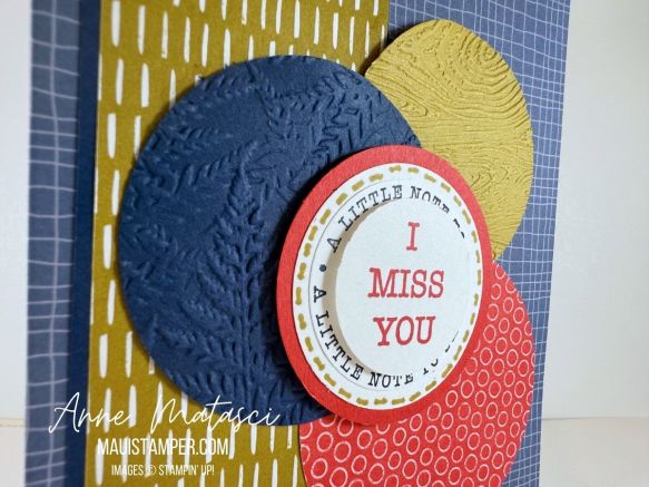Accessories: Stamp Cut & Emboss Machine, Fern 3D 3Embossing Folder, Timber 3D Embossing Folder, Circle Punches in 2 3/8 and 2″ (and a couple of retired circle punches), Calming Creek Cards & Envelopes, 23-25 In Color DSP, Brights DSP, Stampin’ Write Marker, Stampin’ Dimensionals
