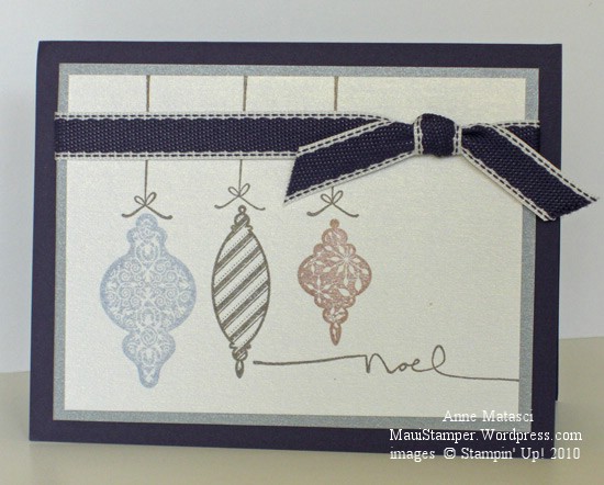 This bag uses stamps from Tree Trimmings, Delightful Decorations, and Many Merry Messages. The ornament on the panel is 3 stamped ornaments punched with the ornament punch. Each one is scored down the center and then adhered back to back to make a 3-D ornament. These are also fun to do as 360 degree ornaments – I use six punched shapes to make a paper ornament. I thought I’d posted some of these a while back, but I can’t seem to find them – I’ll have to take some photos to show you what they look like.