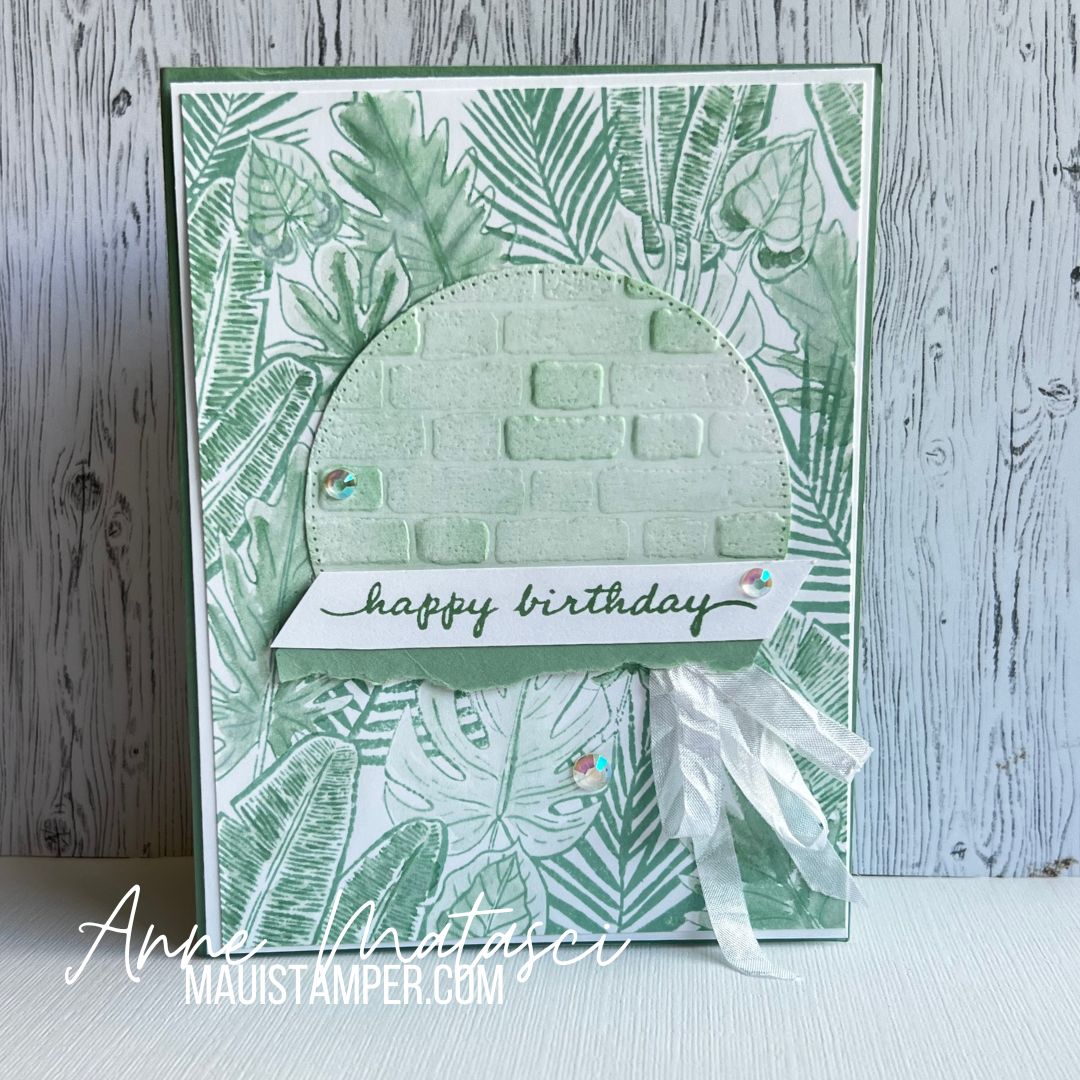 I’ve been exploring different ways to color the Tropical Hideaway large format stamp. I have to confess: this is not my favorite. I’m happy with the card layout, but the watercolor technique I used made the images blur. That’s how you learn!