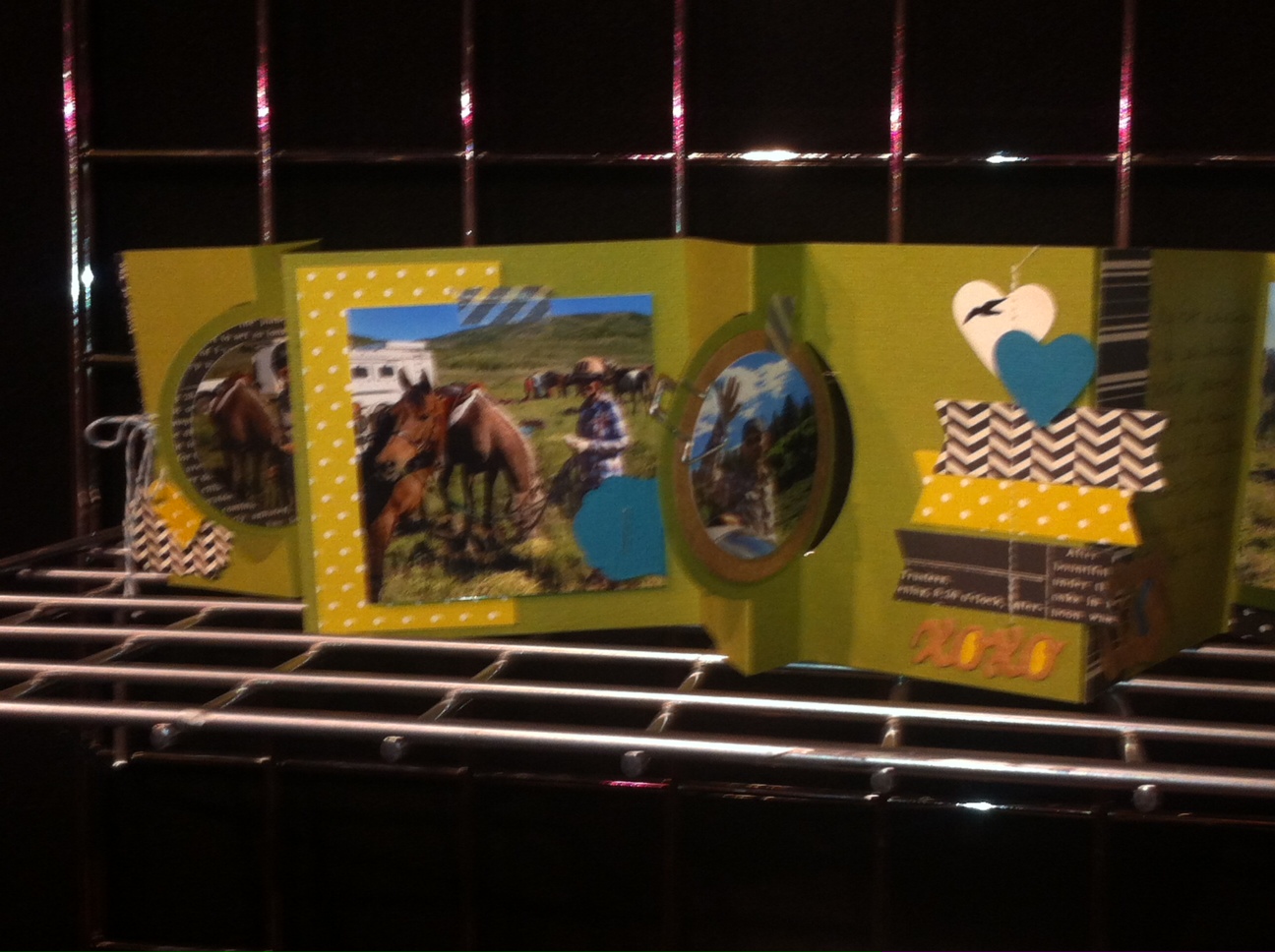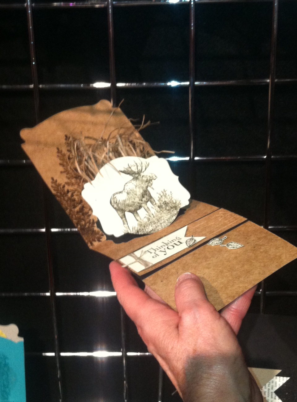 If you stretch the entire card out, this is what the first side looks like. You’re seeing the front of the card, the back of the flip, and the inside of the card. The Baked Brown Sugar panel was run through the Honeycomb TIEF before I adhered it to the Old Olive card base. I added a strip of white card stock (more details HERE) to the inside for additional writing space, and I put a Crushed Curry 2 1/2″ circle behind the flip to give it a finished look. I might write an additional note here, or I might add a photo. And yes, this is an extended card. Patty Bennett has made an excellent tutorial – see it HERE.