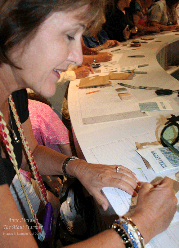 I stamped this sentiment from Yippee Skippee three times in three colors of ink and cut them up. There’s a strip of Crushed Curry card stock stamped with the diagonal lines from Gorgeous Grunge behind the words to serve as an anchor. Lining that up was definitely a job for the Stamp-a-ma-jig.