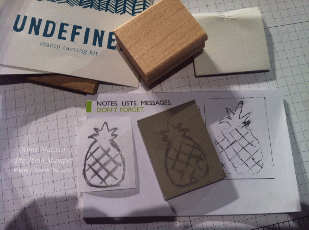 The pineapples are inked with markers and masked. I carved just one pineapple, and I carved it in a hurry! It has a folksy, rustic look to it.