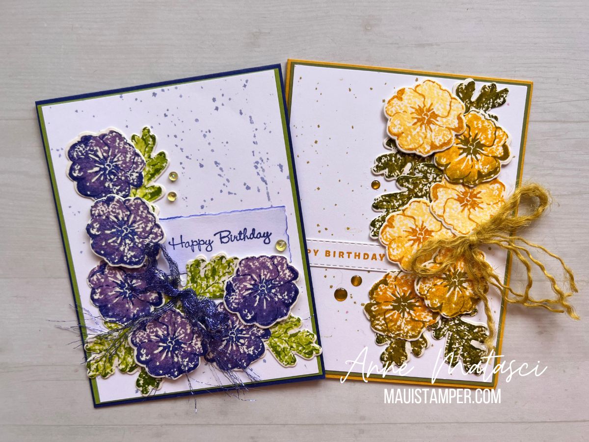 I don’t have the Tropical Leaf Bundle that she used, but these flowers made me happy. I tried a number of color combinations, and the range of yellows and purples were very satisfying. For this technique, it makes a big difference to have that two-step outline. It adds shape and definition to the soft, flowing watercolor.