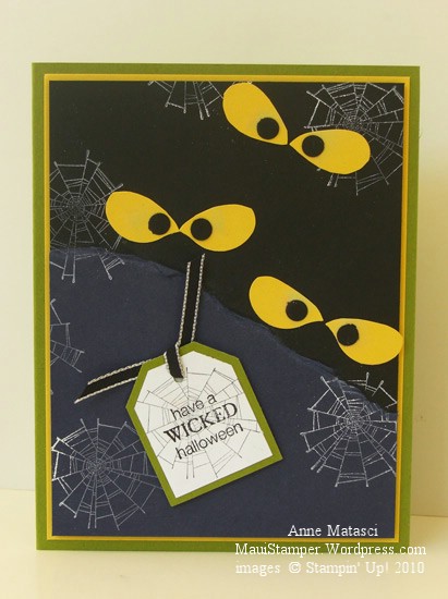 It’s the ever-talented Kellie again – I think we need to get that girl her own blog! She’s kinda busy though, and she’s generous enough to let me share her artwork with you. This is the Fancy Favor Bigz die for the Sizzix Big Shot. She put vellum windows on either side and stamped them with the bats and spider web from the Wicked Cool stamp set. One of those little battery operated tea lights would be just the thing inside this luminaria, don’t you think?
