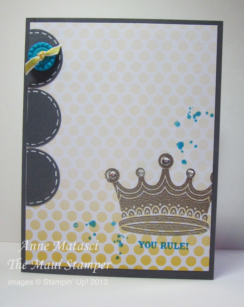 A few Basic Grey circles, some Tempting Turqoise ink, my Uniball white gel pen, a snip of 1/8 inch Daffodil taffeta ribbon, some Pewter Embossing Powder (you NEED this) and some bling were all added into the mix for this card. The stamps are You Rule from the Spring Catalog.